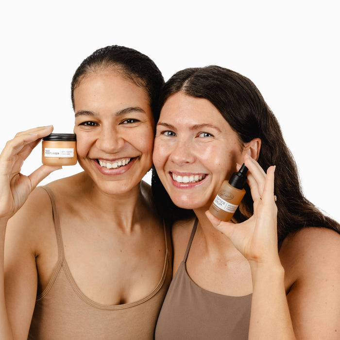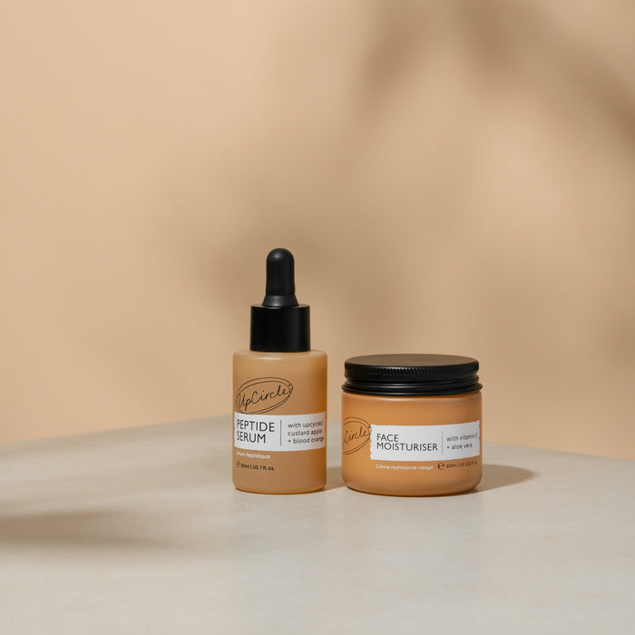 UpCircle products feature upcycled ingredients, helping to fight food waste! In this duo find hydrating blood orange in the Peptide Serum & strengthening argan shell powder in the Face Moisturizer.