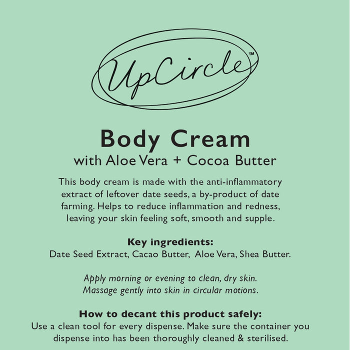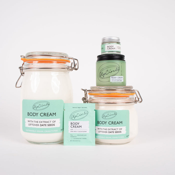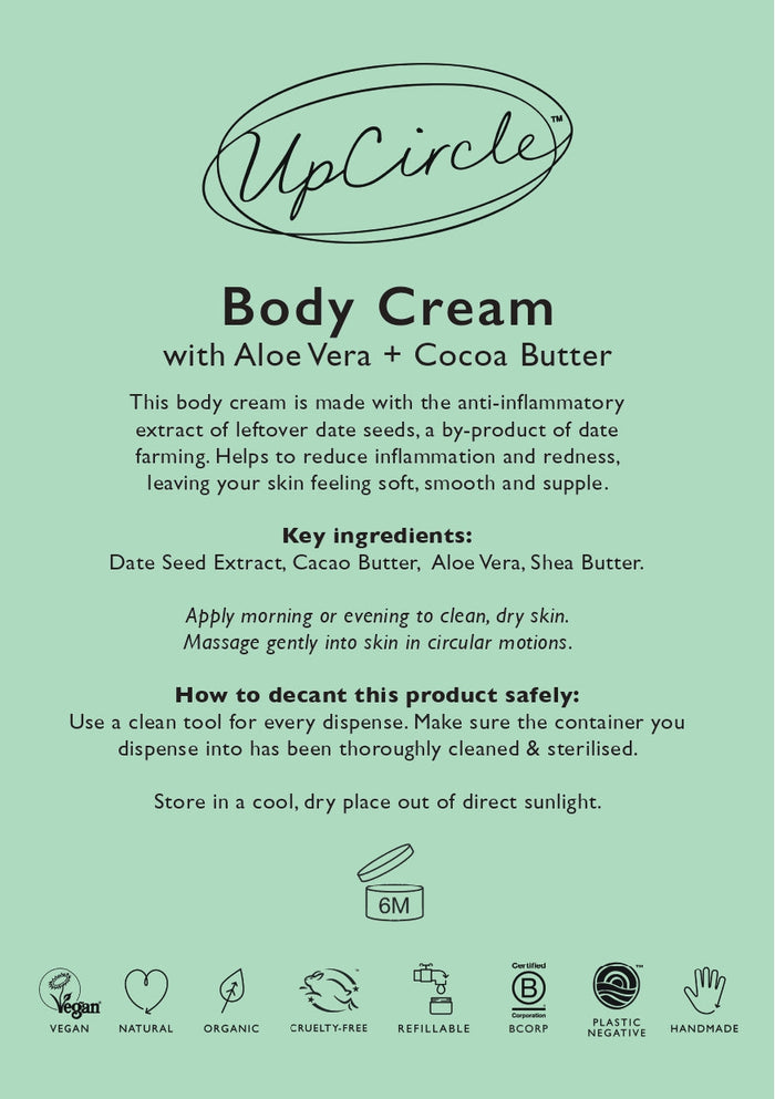 Our award-winning, hydrating Body Cream for all skin types with nourishing shea butter, linseed and olive oil. Made with the anti-inflammatory extract of upcycled date seeds, a by-product of date farming.