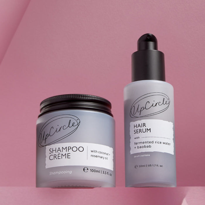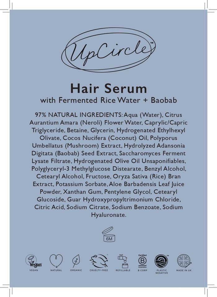 Introducing one half of UpCircle's newest haircare additions... the nourishing Hair Serum! It uses upcycled & fermented rice water to strengthen hair, leaving locks with a smooth & defined finish. A leave-in conditioner that protects against heat + UV damage.