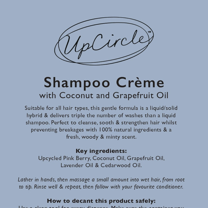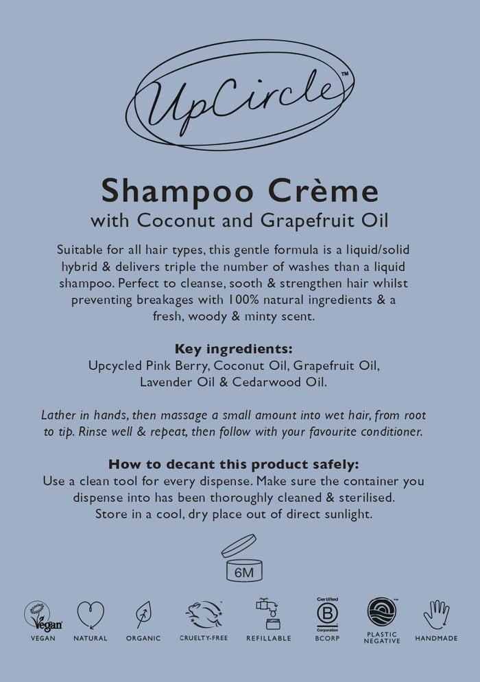 Lather in hands, then massage a small amount into wet hair, from root to tip. Rinse well & repeat, then follow with the UpCircle Conditioner Crème!